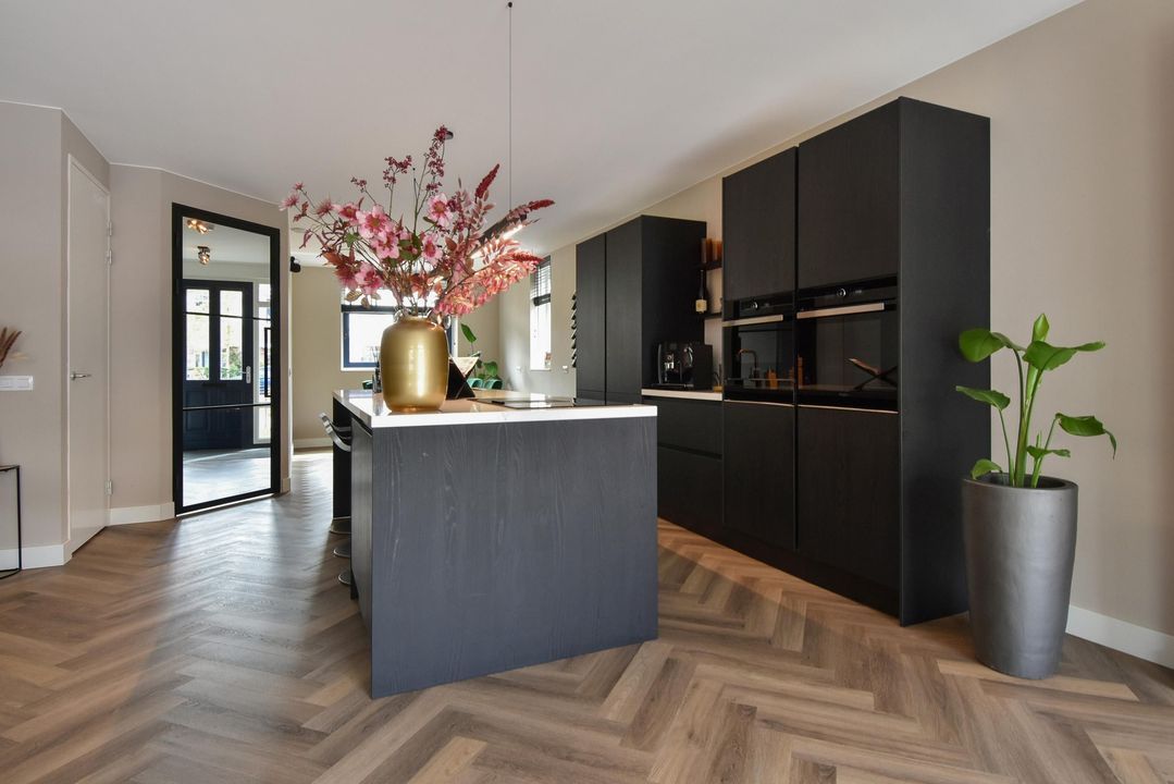 Loop je verder, dan opent de woning zich. De visgraat pvc-vloer met vloerverwarming leidt je de woonkamer in en geeft meteen een warme, luxe uitstraling. Aan de voorzijde wacht de open keuken: het kloppend hart van het huis. Het kook- en spoeleiland vormt de perfecte plek om samen te koken, te borrelen of gewoon de dag door te nemen. Dankzij de hoogwaardige inbouwapparatuur – van combi-oven tot bordenwarmer – voelt iedere maaltijd hier als een klein feestje.